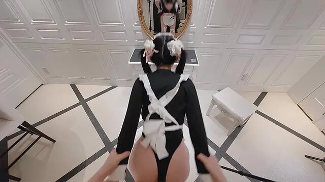 A petite, cute Asian girl dressed as a maid takes her cosplay to the next level with an ahegao expression as she gets pinned from behind. She's forced into doggy style and gets a hard pounding before the lucky guy fills her up with a creampie.