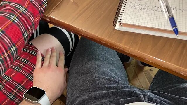 College girl gives a discreet handjob to her classmate under the table during a lesson. The risky public masturbation makes them both excited. He cums all over her hand, and they quickly wipe it clean before the teacher notices.