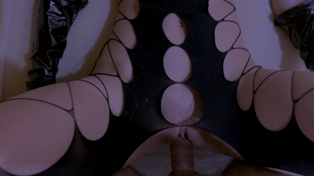 Sultry chick in a latex bodysuit rides cock cowgirl with her big ass on display. She asks "Don't cum inside me" before switching to doggystyle, where he pounds her perfect pussy. He blows his load all over her fishnet-stockinged bubble butt in POV.