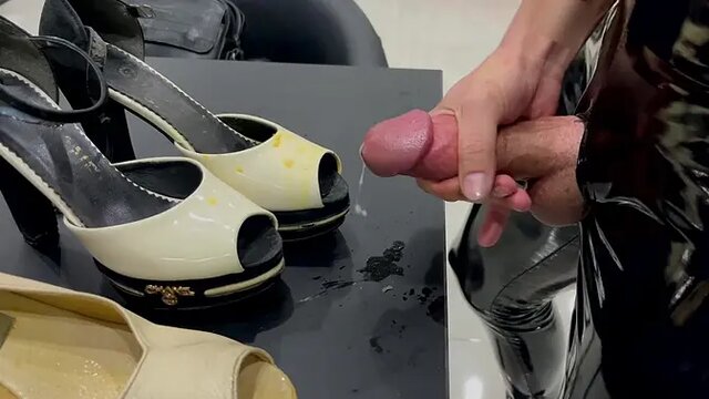 Fucking Wedge Heels Full of Dried Cum in Latex Pants and Cum on High Heels