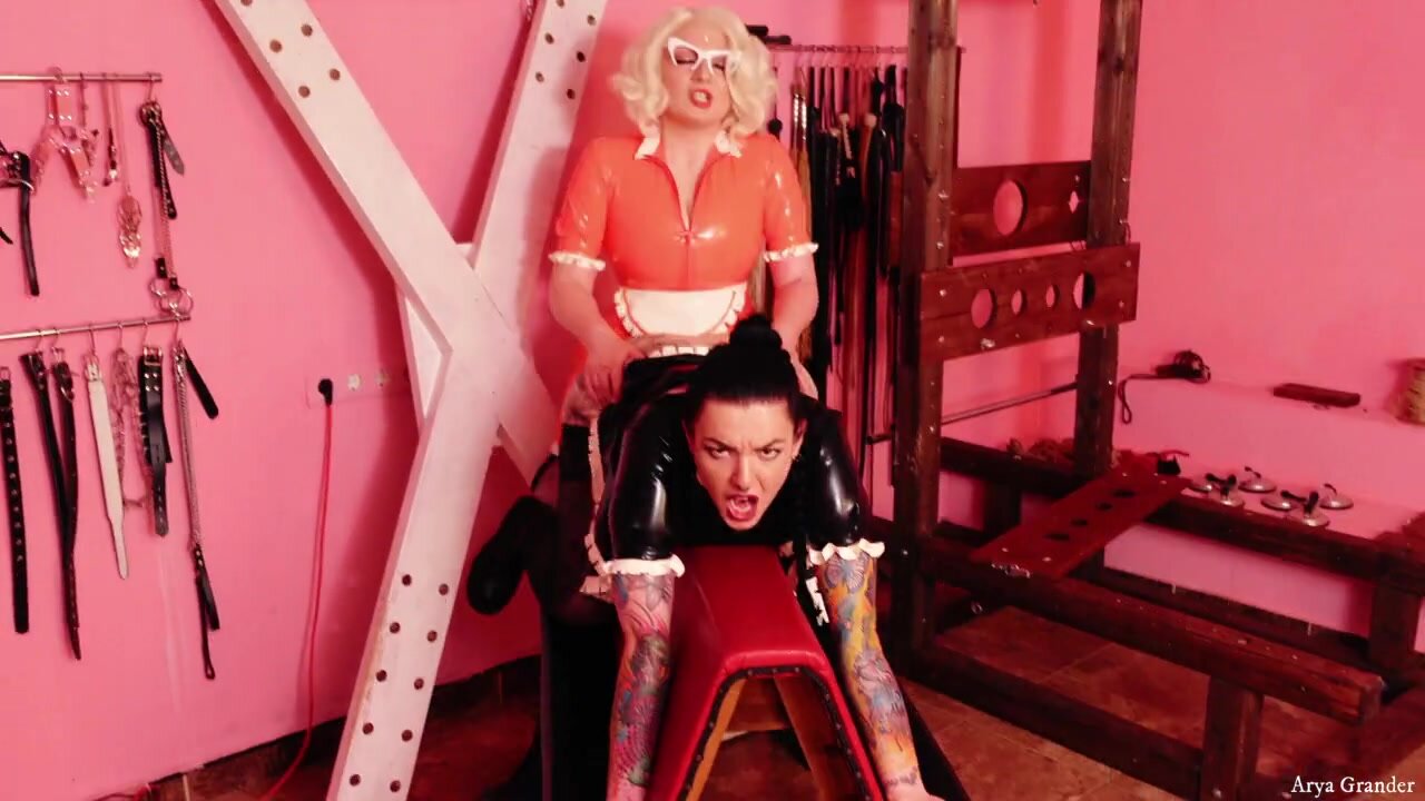 Latex-clad ladies engage in strap-on sex and playful slit teasing