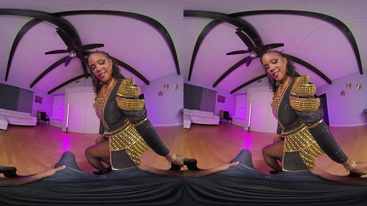 August Skye, portraying Catherine of Aragon, gives a deepthroat blowjob to a large black cock in POV. She rides him in cowgirl and reverse cowgirl positions, with her big boobs bouncing. Finally, she gets on all fours for doggystyle while he licks her vagina.