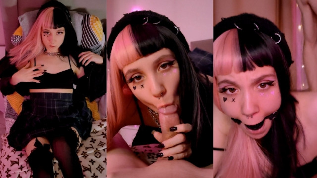 A skinny 18-year-old with tattoos and a piercing sucks my cock in a loud and enthusiastic POV blowjob. I gag her mouth and fuck her hard, finishing with a face full of cum. She swallows it eagerly, showing her small tits.